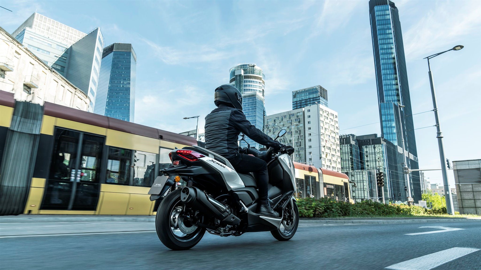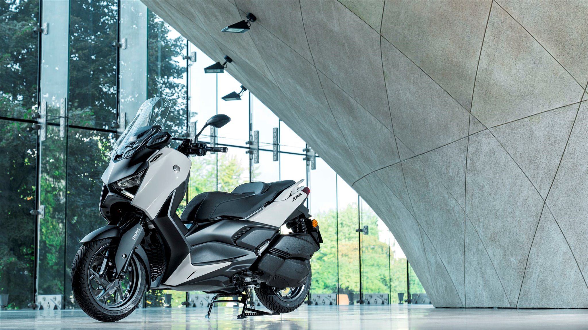 Für einen maßgeschneiderten Windschutz ist der XMAX 300 Tech MAX+ mit einer elektrisch einstellbaren Verkleidungsscheibe ausgestattet, die sich stufenlos um 95 mm variieren lässt, und das speziell designte Gehäuse der vorderen Blinker und der Frontspoiler verbessern die Aerodynamik. Zusammen mit dem einstellbaren Lenker und den geräumigen Trittbrettern ist es für den XMAX 300 Tech MAX+ Fahrer einfach, seine ideale Sitzposition zu finden.